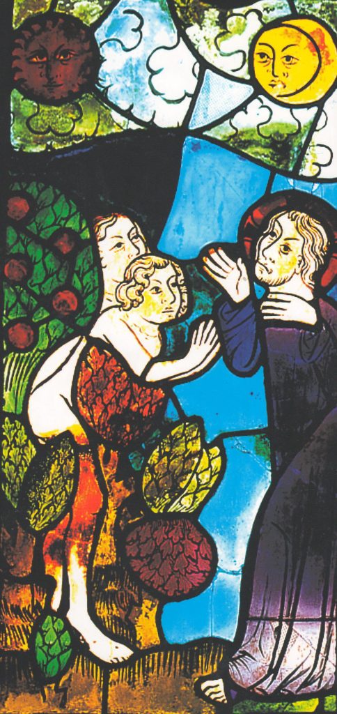 The following is a stained glass window from the Three choir windows in the Marienkirche, Frankfurt (Oder), Germany, of the 14th century, depicting God calling out to Adam who is hiding: