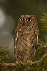 The scops owl is a tiny eared owl that is a mottled gray in color. By day it perches close to the trunk of a tree, where its mottled coloring blends in with the tree bark, making the owl look like the stump of a broken branch. It has a soft, trilled call.