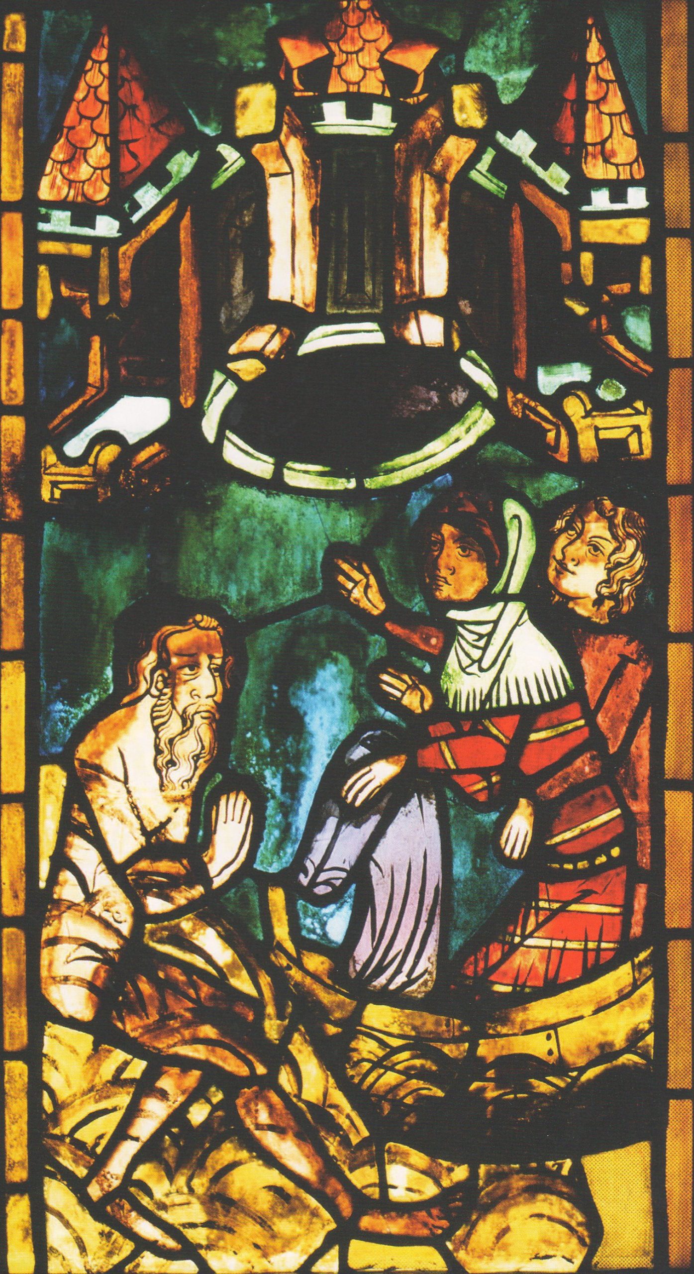 The following is a stained glass window from the Three choir windows in the Marienkirche, Frankfurt (Oder), Germany, of the 14th century, depicting the healing of Naaman: