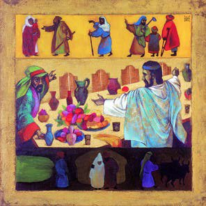 Following is a 1973 painting of the JESUS MAFA project, a response to New Testament readings from the Lectionary by a Christian community in Cameroon, Africa. Each of the readings was selected and adapted to dramatic interpretation by the community members. Photographs of their interpretations were made, and these were then transcribed to paintings: