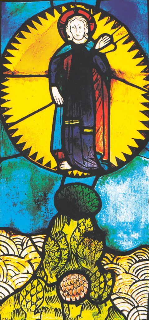 The following is a stained glass window from the Three choir windows in the Marienkirche, Frankfurt (Oder), Germany, of the 14th century, depicting God creating dry land: