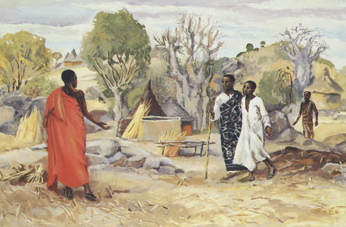 Following is a 1973 painting of the JESUS MAFA project, a response to New Testament readings from the Lectionary by a Christian community in Cameroon, Africa. Each of the readings was selected and adapted to dramatic interpretation by the community members. Photographs of their interpretations were made, and these were then transcribed to paintings: