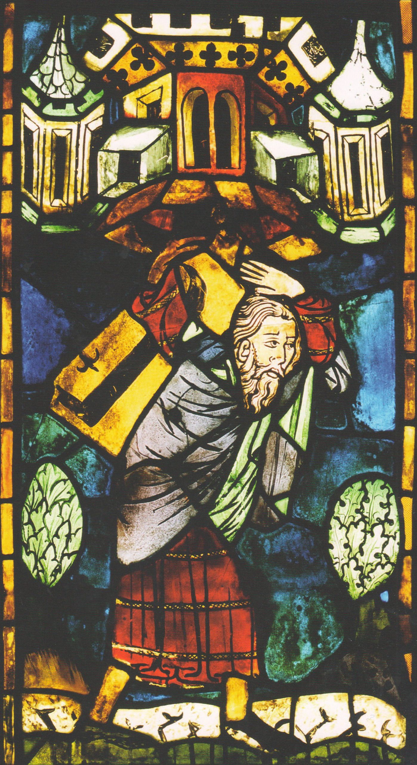 The following is a stained glass window from the Three choir windows in the Marienkirche, Frankfurt (Oder), Germany, of the 14th century, depicting Samson carrying the gates of Gaza: