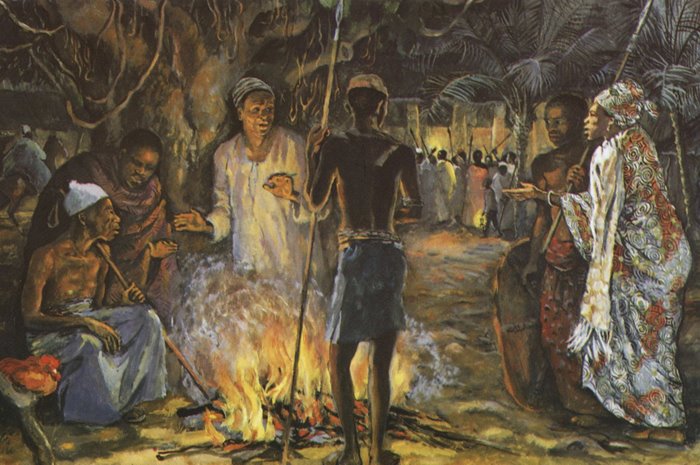 Following is a 1973 painting of the JESUS MAFA project, a response to New Testament readings from the Lectionary by a Christian community in Cameroon, Africa. Each of the readings was selected and adapted to dramatic interpretation by the community members. Photographs of their interpretations were made, and these were then transcribed to paintings: