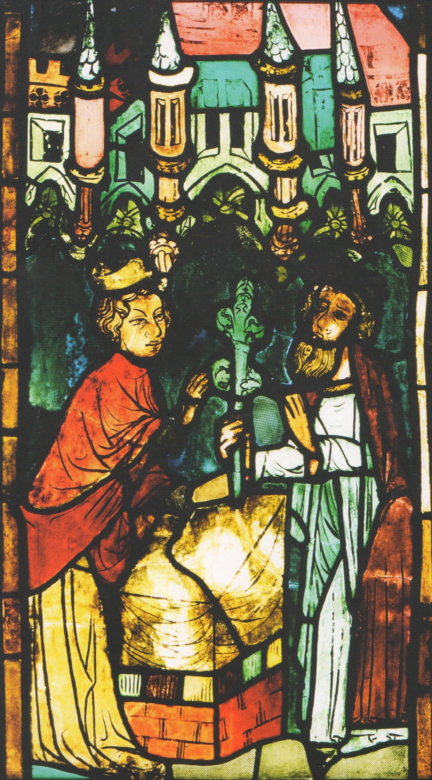 The following is a stained glass window from the Three choir windows in the Marienkirche, Frankfurt (Oder), Germany, of the 14th century, depicting the budding of Aaron’s rod: